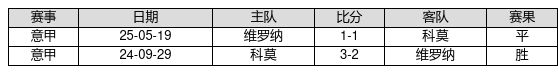 科莫 VS 维罗纳两队近10年的交战次数为2场,科莫1胜1平0负,赢球概率为50.0%,平局概率为50.0%,输球概率为0.0%。