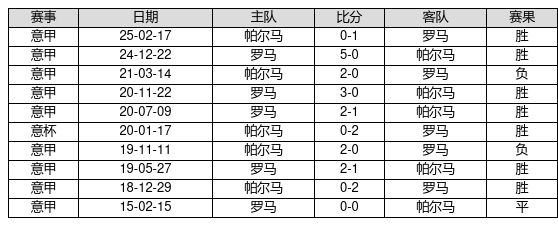 罗马 VS 帕尔马两队近10年的交战次数为10场,罗马7胜1平2负,赢球概率为70.0%,平局概率为10.0%,输球概率为20.0%。